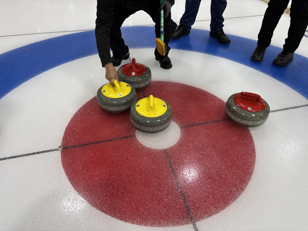 當紅色與黃色的ストーン(冰壺石)逐一滑入ハウス中心,參加者必須不斷判斷距離、角度與順序。