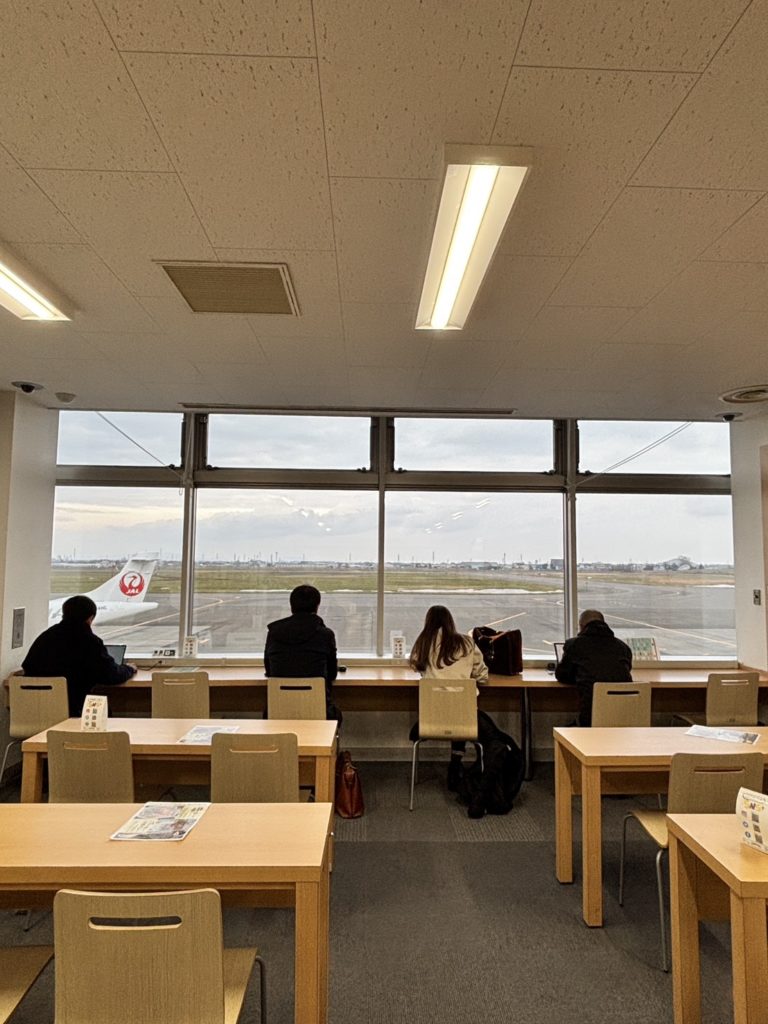 整片玻璃看出去,就是跑道和札幌的城市線,光線炫亮但柔和,有些乘客就安靜地坐著,看著飛機準備起飛,這裡不像其他機場每個角落都人潮洶湧,而是大家都很自在,像在圖書館,也像在咖啡館。